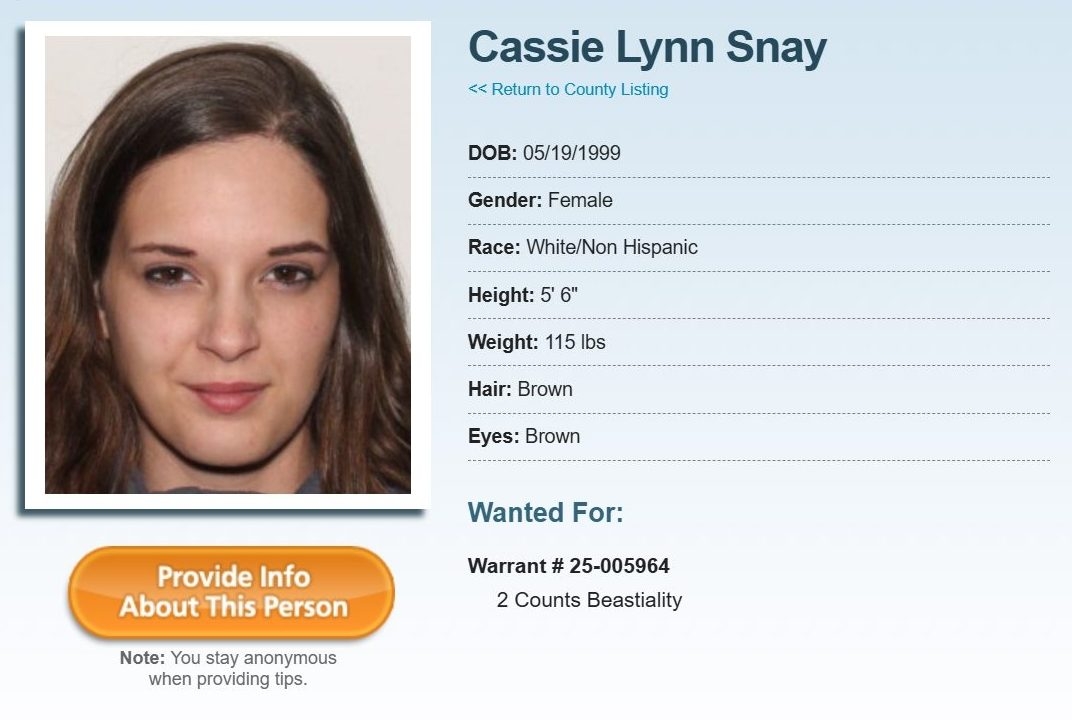Meanwhile, Cassie L. Snay, 26, has been charged with two counts of bestiality and made her first court appearance Monday in Allen Superior Court. She reportedly admitted to cops that they weren’t backing up the wrong tree.
